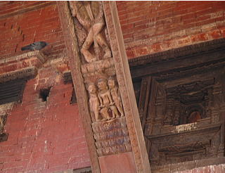 ![]() バクタプールの五重塔には、こんな彫り物も。生殖=聖なるもの、という考えがそこにはあります。 |