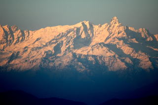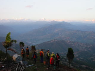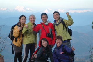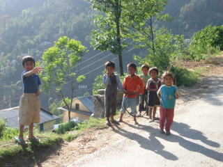 カトマンズは盆地。その縁まで登ると、ヒマラヤの大展望が開けます。そこまでは勾配の少ない、気持ちいい道を選んで登りました。 子供たちのナマステ〜(こんにちは!)の声に こちらも大声でナマステ!で応えました。 |