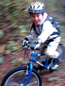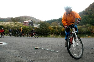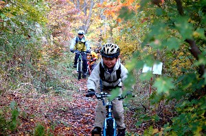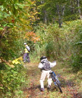 シングルトラックに入る前に、MTBゲームで白熱。 みんなどんどんうまくなる! |