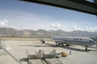 ラサ・ゴンカル空港到着。着陸体勢になると、飛行機の中の空気がだんだんと薄くなってきました。まずは大きく深呼吸! |