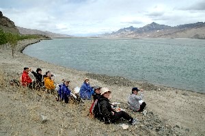 午後はバス移動。途中、景色のよいところを選んで、弁当を食べます。目の前は、 西チベットの聖山・カイラスより、ヒマラヤに沿って流れる大河、ヤルツァンポー川 |