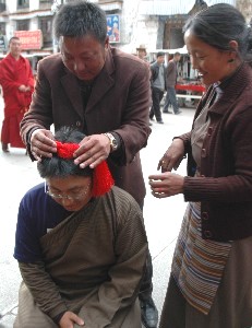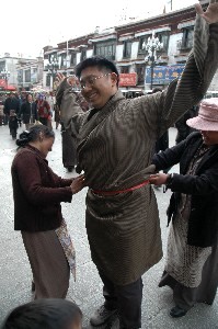バザールに繰り出し、チベット服を買出し! カムパ(東チベット地方の人)にそっくりなIさんが、 その服を買おうとしたら、お店の人はノリノリ! |