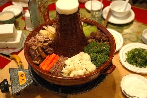 チベットの宮廷料理、ギャコック。チベット版のお鍋というところ。100種類の具を入れるところから、この名前が付いたとか(ギャ=100)。ヤクの骨の出汁がとっても旨い! |