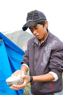 チベットのハニカミ王子クンが、チベットの 主食のツァンパ(麦焦がしをコネコネ |