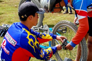 ![]() リアディレイラー破損。 即座にスペアに交換してくるメカニシャンのヘンリーくん。 |