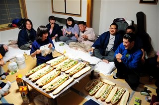 食後は部屋で、翌日のランチ(ニワの燻製サンドイッチ)を 作りつつの大小宴会! |