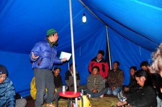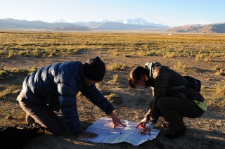 ![]() 地図を見ながら、あの山がチョー・オユーで・・・。 |