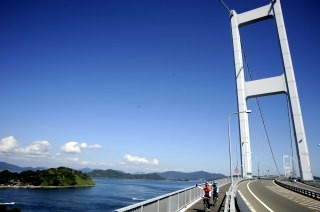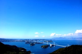 ![]() 上りきると、これから渡る来島海峡第一・第二・第三大橋(全長約4km)と、 その向こうに四国が見渡せる。 |
