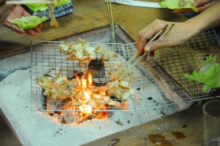 ![]() ベーコンを囲炉裏で炙り・・・、 |