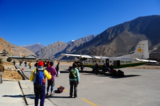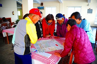 ![]() 飛行機の待ち時間に、ヒマラヤ全体の地図を見て作戦会議。 なぜ、広いヒマラヤの中で、このルートを選んだのかを説明したり、 ルートの全体イメージをお知らせした。 |