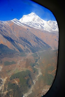 ![]() 飛行機の窓からは、ヒマラヤの白い峰が。 そして眼下にはこれから走るルートが続く。 |