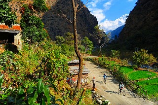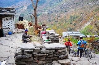 ![]() 村を通り過ぎる。 この建物はヒンドゥ教のもの。 高度が下がるにつれて、仏教からヒンドゥ教色が強くなるのもおもしろい。 |