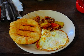 ![]() ボクの朝食はチベットパンと目玉焼き&ジャガイモとトマト炒め。 ネパールでのボクの定番朝食。 |