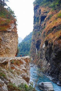![]() ヒマラヤから流れ出るカリガンダキ川の大峡谷。 8000m峰のアンナプルナの稜線がここに切れ込むわけで、 その谷の深さは6000mで世界第一、ともいわれる |