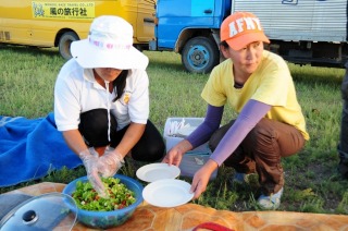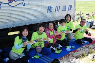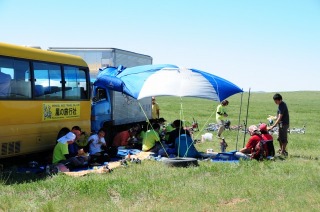 ![]() 草原の向こうにサポートカーを発見。 木陰で(日差しが強い)ランチ。 |