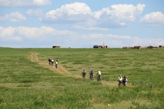 ![]() ほしのいえに泊まる乗馬グループと合流。 ここで、馬と自転車を交換して、互いに新しいアプローチで草原を体験。 乗馬グループも自転車で笑顔! |