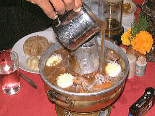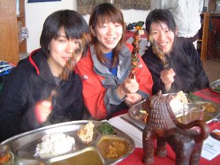 | 【食べ物 その2 米】 ネパールはインディカ米っていわれるパサパサのお米。これをマズイとはいわせない。カレーの汁を染み込ませたり、はたまた炒めたりするには、この方が味が染み込むので断然ウマイ。ちなみにニッポンのしっとりご飯は、それ自体がとってもおいしいので、ニッポンの食べ方のように、おかずと別々に食べるにはいいのでは。ニッポンもネパールも、それぞれが食材に合わせた、ウマイ食べ方を選んでいるなと妙に納得。 ところでこのパサパサご飯。ニッポンのにくらべて当然軽いのでとってもたくさん食べられる。最初に盛り付けられたときは、こんなに食べらんないって、みなさんもビックリでしたら、案外ペロリ&お替り〜、でした。。 |