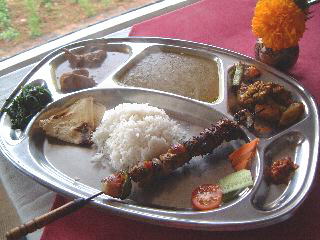 メニューはネパール料理の定番、ダルバート。ダル(豆、豆スープ)+バート(ご飯)ということで、ネパールのカレーライスというところか? |