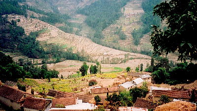 | 【なんとヒマラヤが見えない…】 ネパールについた翌日から、2泊3日でカトマンズ近郊のツアーに出かけました。カトマンズというのは盆地で、その周囲を2000mくらいの山(ネパールでは丘)に囲まれているわけですが、そこまで登れば(約2時間)ヒマラヤの夕日と朝日が、それぞれ2回ずつドッカーンのはずだったのです。 もちろん初日の出も! ところが、初日の夕日は見られたものの、それ以降は霧の中。この時期にしては珍しく、雨も降り出す始末。土地の人が言うには、冬の間も1〜2回は雨が降るとか。その雨で作物が育ち始めるとはいってましたが、なんてアンラッキー…。 |
