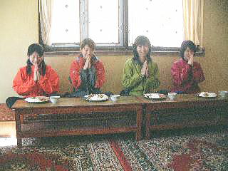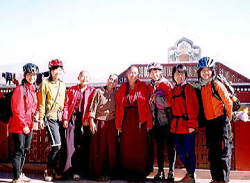 | 【とってもチベタンなツアーでした B 尼寺】 カトマンズ近郊のワンデイライドに出かけたときも、尼寺に寄ろうといったのはガイドのソナム氏。彼の出身地の多くの人は、村を離れ、カトマンズ近郊で暮らしているので、村にあった尼寺をそのままカトマンズにも建ててしまったというワケです。村人たちの寄付や奉仕労働によってできたというのがまたスゴイ。 女性どうしだし、きっと何か感じるものがあるのではとの想いが彼にはあったようですが。ともあれ、お茶(バター茶!)をご馳走になり、そのままお昼ご飯まで頂いてしまいました。 それにしてもあのお寺からのヒマラヤの山々は、ホントにキレイだった! ![]() 尼寺で、尼さんたちと一緒にパチリ |